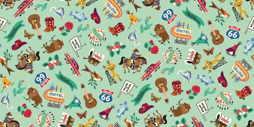 This custom-made RT66 fabric has added touches of all the things we love about Oklahoma. This collection features 15 prints along with an Oklahoma panel!